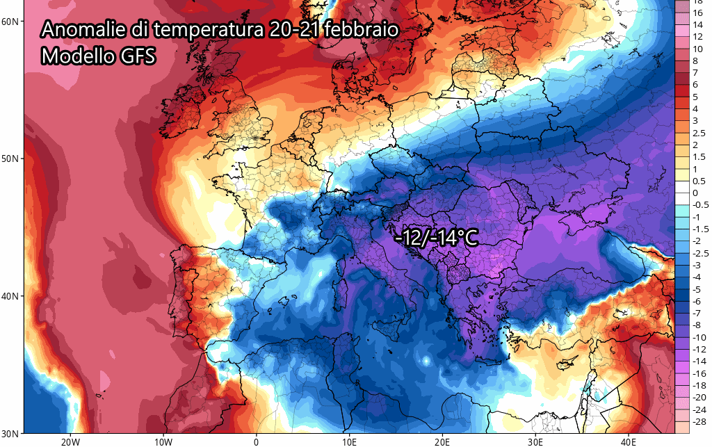 L’arrivo del gelo in Italia, tra 20 e 21 febbraio, sarebbe di notevole fattura come ci mostrano le anomalie previste da GFS. Fino a -12°C sotto le medie su più di mezza Italia, corrisponderebbero ad un’ondata di gelo capace di portare la neve fin sulle coste adriatiche e del sud.