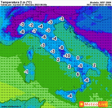 Infine, questa è la mappa delle temperature al suolo previste per le ore 6 di martedi 7 febbraio: