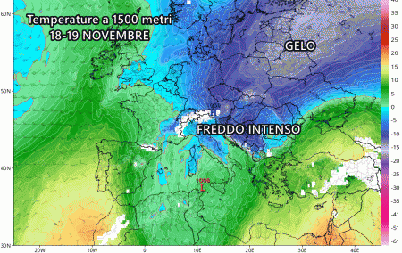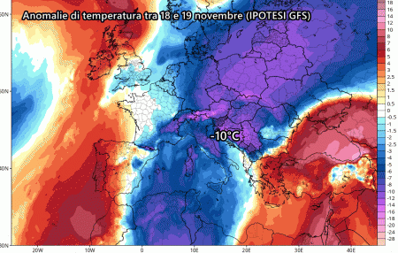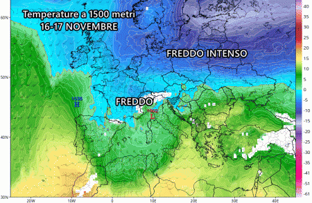 I primi venti freddi da nord-nordest si potrebbero avvertire nel nord Italia intorno al 16 o 17 novembre, portando con sé maltempo e nevicate a quote che si abbasserebbero progressivamente.