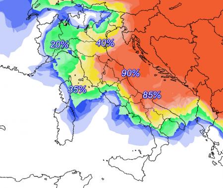 Tra sabato e domenica trionfo dell’aria fredda sullo stivale italiano, con isoterme davvero da brivido. Ecco le probabilità di avere isoterme inferiori a -10°C alla quota di circa 1500 metri domenica 14 febbraio:
