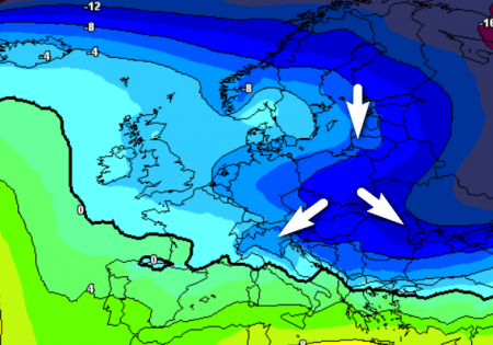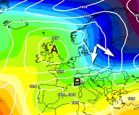 Ecco una carta barica che illustra la situazione prevista per la notte su sabato 6 marzo, notate l’anticiclone che si ritira temporaneamente sul Regno Unito e lascia spazio all’inserimento di aria fredda da nord-est, che subito scaverà un modesto minimo pressorio al suolo sul settentrione: