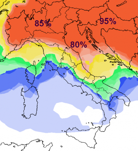 La mappa prevista per domenica 7 marzo, relativa alla probabilità che tale evento si verifichi, non lascia molti dubbi: la colorazione rossa segnala che l’evento è probabile almeno all’85%, a 1500m potrebbero raggiungersi valori prossimi ai -5°C al nord e su parte del medio Adriatico: