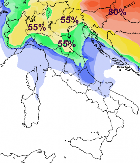 Più difficile invece pensare che si arrivi a raggiungere valori inferiori a -5°C alla stessa quota, come si nota dalla mappa seguente; la probabilità non supera il 55%: