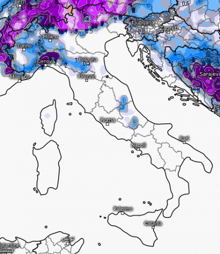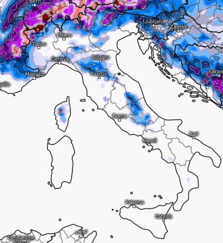 Naturalmente nelle primissime ore lo scorrimento di aria mite sul cuscino freddo padano potrebbe favorire qualche fugace situazione nevosa anche in pianura sul nord-ovest, ma al momento solo un modello (quello canadese) prevede qualche fiocco in pianura tra Piemonte e Lombardia (molta neve sul settore genovese dell’Appennino ligure), per il resto sul settore alpino le nevicate si attesteranno dapprima oltre i 500m, per innalzarsi progressivamente oltre i 1000m.