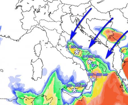 Ecco la probabilità di pioggia attesa a cavallo ta domenica sera e lunedì mattina, si evince come le maggiori precipitazioni che saranno NEVOSE fino a quote prossime la pianura, potranno colpire ancora le regioni meridionali, in particolar modo il medio e basso versante adriatico, la Basilicata, la Campania e la Sicilia: