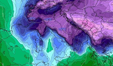 Ecco il picco del freddo previsto domani mattina, con temperature molto rigide al nord e lungo i versanti adriatici, con picchi fino a -12°C alla quota di circa 1500 metri: