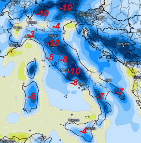 Segnaliamo 10° in meno rispetto alla norma sulle Alpi centro-orientali; tra gli 8 e i 10° in meno nelle aree interne del centro, 7-8° in meno nelle aree interne del sud, 4-5° in meno sulle Isole e il restante meridione…il tutto accompagnato da forte vento settentrionale.