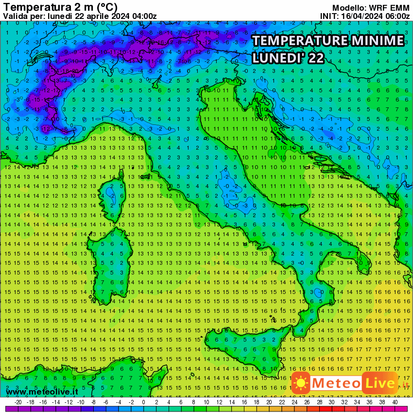 Tuttavia, l’assenza di depressioni organizzate favorirà l’assenza di vento, soprattutto di notte, il quale, unita ai cieli sereni notturni, innescherà un forte calo delle temperature su valli e pianure a causa del fenomeno dell’irraggiamento notturno. Questo significa che a partire dal fine settimana ci sarà un serio rischio di gelate e brinate tardive, soprattutto nelle zone di campagna e le valli alpine, prealpine e anche quelle appenniniche. Di seguito vi mostriamo le temperature minime di lunedì che potrebbero portarsi attorno ai tre o 4 ° su tante città del Centro Nord Italia. Nelle zone di campagna, nelle valli, queste temperature potrebbero essere molto più basse e scivolare anche al di sotto dello zero.