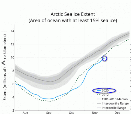 La curva tratteggiata rappresenta l’estensione del ghiaccio durante l’anno solare 2012 mentre quella turchese l’estensione di quest’anno, ovvero il 2020. Come potete vedere, ottobre e novembre non hanno invertito il trend, anzi, si prosegue attorno al minimo storico che è inferiore a quello rilevato nel 2012.