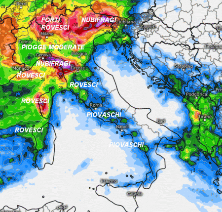 Si rischieranno NUBIFRAGI tra l’alto Veneto, il Trentino, il Friuli, la Liguria centro-orientale e l’alta Toscana. Forti rovesci tra alto Piemonte e alta Lombardia, nonchè sulla Sardegna occidentale. Piovaschi o rovesci anche lungo il Tirreno e le aree interne fino alla Campania, per il resto tempo asciutto. Neve sulle Alpi in media tra i 1500 ed i 1800 metri.