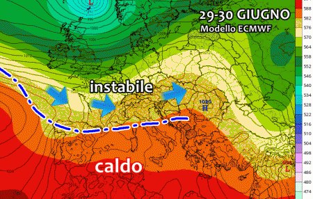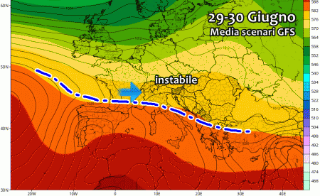 Un altro cambiamento si prospetta sul finire del mese, ovvero nella seconda parte della prossima settimana. Tra 29 e 30 Giugno una vasta saccatura proveniente dal nord Atlantico potrebbe scivolare con più convinzione verso l’Europa centrale, riuscendo anche a lambire l’Italia quel tanto che basta per dar vita ad una frequente instabilità convettiva.