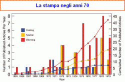 Non si può nemmeno citare la fase di grande preoccupazione degli scienziati per l’effimero raffreddamento terrestre negli anni 70, perchè subito viene portato come esempio il grafico riassuntivo degli articoli apparsi in quel periodo: la maggioranza si stava ancora preoccupando del caldo che sarebbe venuto…dopo. Sorge più di un dubbio a tal proposito: quale direttore di testata, vedendo fuori dalla finestra tonnellate di neve, avrebbe concesso di pubblicare articoli sul global warming? Noi rispetto a quel periodo, come già pubblicato su ML, abbiamo trovato molti articoli preoccupati soprattutto per la nuova era glaciale imminente.