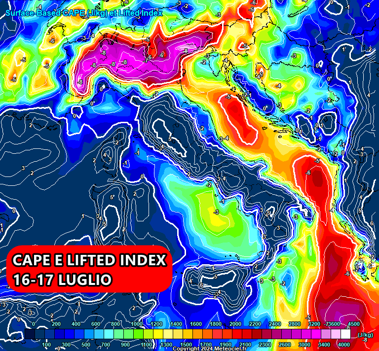 Tutta questa calura che andrà ad accumularsi in Val Padana creerà un cuscinetto d’aria molto calda, pregna di energia, pronto a dar manforte a eventuali temporali di calore che potranno svilupparsi nei prossimi giorni al Nord. Eloquenti i valori di CAPE e Lifted Index previsti ad inizio prossima settimana. Sulla Val Padana possiamo notare CAPE superiore ai 2800-3000 J/Kg su vasti territori, indice di altissima energia potenziale per eventuali violenti temporali: