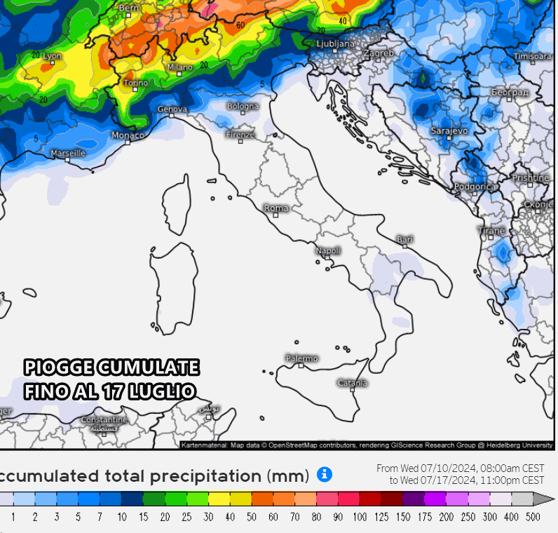 Si tratterà di fenomeni disorganizzati e intermittenti ma localmente violenti poiché trarranno la propria energia dall’altissima concentrazione di vapore e calore presente sulla Val Padana. Questi temporali improvvisi, concentrati soprattutto nelle ore serali e notturne, coinvolgeranno le aree alpine, prealpine e i settori pedemontani dal Piemonte al Friuli Venezia Giulia, come si evince anche dagli accumuli di pioggia totali previsti nei prossimi 7 giorni: