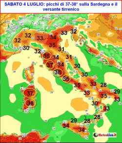 Sabato, la situazione più difficile la avremo in Sardegna e lungo le regioni del versante tirrenico. Su queste zone si prevedono punte di 37-38°. In altre parole, i 40° saranno ad un passo, anche se probabilmente non verranno raggiunti.