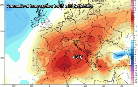 Su questo punto non ci sono più dubbi: gli anticicloni subtropicali saranno ancora molto invadenti e causeranno temperature notevolmente superiori alle medie stagionali, specialmente al sud, come mostrato dalla mappa delle anomalie del modello GFS per un periodo di 5 giorni tra il 15 e il 20 settembre. Osservando la mappa, tutta l’Italia, così come gran parte dell’Europa centrale, presenta temperature superiori alle medie del periodo: