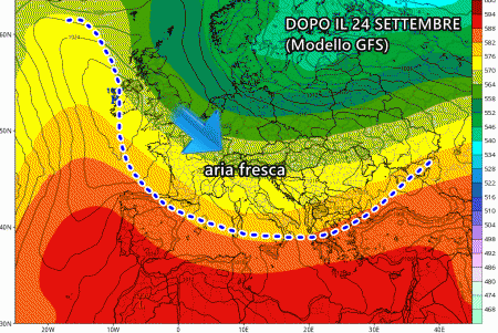 Il modello americano, al contrario, indica un’ondata di calore persistente anche all’inizio della terza decade, attorno al 20-23 settembre; successivamente, l’aria fresca potrebbe, a più riprese, invadere l’Italia causando un drastico calo delle temperature e diversi episodi di maltempo: