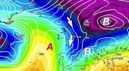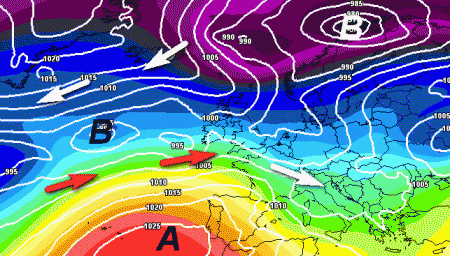 GROSSO: c’è sempre un ostacolo a tutto questo, è vero che l’anticiclone delle Azzorre seguendo il movimento antizonale dovrebbe migrare sin sul Canada, ma c’è sempre l’africano, la grande anomalia barica dell’ultimo trentennio. Lui potrebbe frapporsi a questa alleanza, mettere "i bastoni fra le ruote" deviando le perturbazioni oltralpe e privarci delle preziose perturbazioni, come vediamo qui sotto: