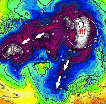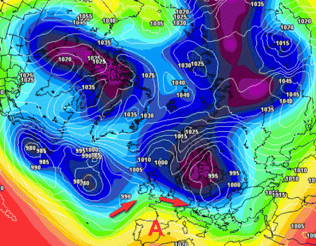 Le mappe che vedete qui sopra sono commentate da Grosso durante la registrazione, seguite l’appassionato commento del nostro previsore. Si riferiscono comunque al nord emisfero e sono previste per lunedì 25 gennaio da alcune emissioni cosiddette perturbatrici, sia a 5500m che al suolo (prima mappa), sia a 1500m, 850hPa.