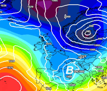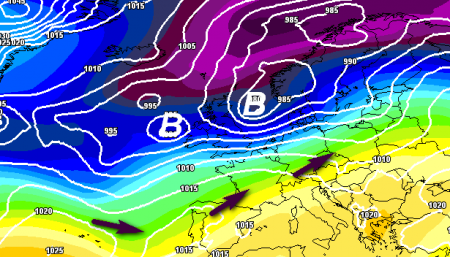Notiamo sempre di più che le tanto invocate perturbazioni da ovest falliscono ormai sistematicamente; l’aria fredda che accompagna questo genere di passaggi perturbati sembra non riuscire più a sostenere i fronti e i modelli spesso ne sovrastimano la portata sino ad arrivare al momento culminante con la perturbazione ormai sfilacciata ed inoffensiva, come vediamo qui sotto, dove si scorge un flusso da sud ovest poco propenso a determinare precipitazioni sull’Italia, tutte le depressioni rimangono ben alte di latitudine: