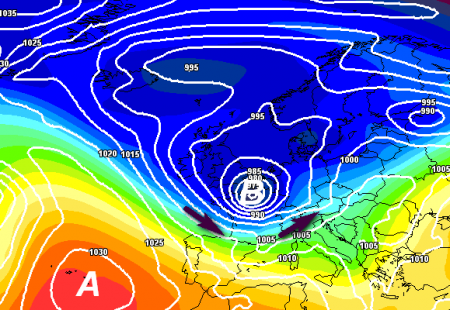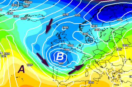 Le saccature devono giungere per quanto più possibile da nord-ovest o da nord, perchè in questo modo il carico di aria fredda non si assottiglia e la saccatura riesce ad arrivare nel Mediterraneo con la giusta vorticità e con possibilità di determinare precipitazioni, indotte magari dall’approfondimento di depressioni secondarie al suolo, come vediamo qui sotto: