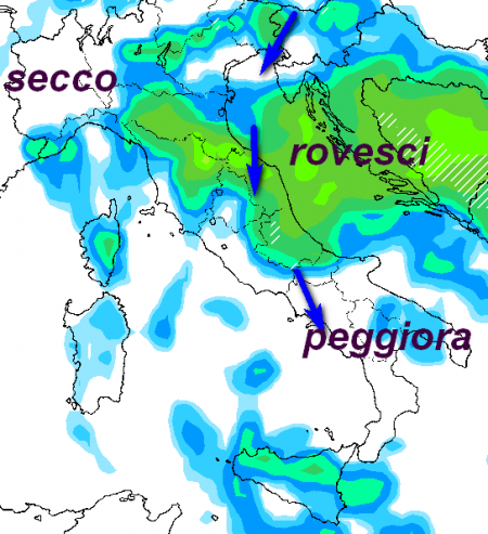 E’ certamente positivo che l’Italia venga raggiunta da nord da impulsi instabili in grado di determinare a macchia di leopardo rovesci e temporali, ma il tutto finisce sempre inserito in un letto di correnti poco favorevoli a far piovere anche al nord-ovest.