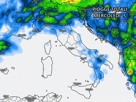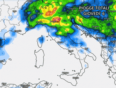 Qui sopra possiamo notare le precipitazioni totali previste mercoledì 5 Luglio. Troviamo accumuli modesti al nord, specie su Lombardia, Veneto, Trentino e Friuli. Si tratterà di temporali sparsi e irregolari.