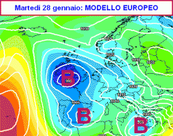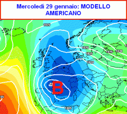 Iniziamo con il modello americano, che per mercoledì 29 gennaio piazza una depressione alquanto fredda tra l’Europa occidentale, il Mediterraneo e la nostra Penisola.