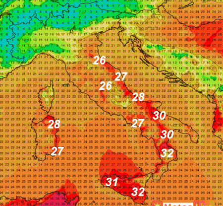 Termometro a 31-32° sulla Sicilia e la Calabria: 30° anche sulle Puglia e la Lucania. Anche il versante adriatico e la Sardegna orientale verranno interessate da questo alito caldo proveniente da meridione ed avranno temperature attorno a 27-28°.