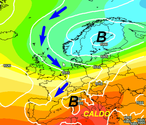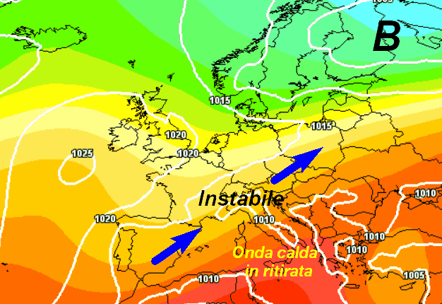 Ecco il settentrione e parte del centro sotto il tiro di aria più fresca ed instabile di provenienza atlantica (frecce blu). Tutto ciò comporterà il ritorno degli acquazzoni e dei temporali specie al nord e nelle aree interne del centro, associati ad un calo delle temperature. Le regioni meridionali e la Sicilia resteranno invece protette dal promontorio africano ed avranno un tempo ancora stabile e caldo.
