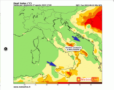 La prima mappa mostra l’indice di disagio da caldo atteso in Italia alle ore 17 di domenica 27 agosto – si consiglia di ingrandire le immagini per avere un migliore riscontro visivo.
