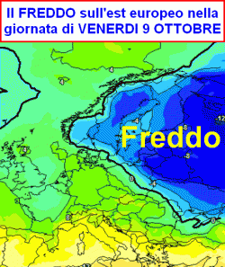 La cartina a fianco riportata ci mostra una lingua fredda che dall’Europa orientale tenterà di protendersi verso occidente nella giornata di venerdì 9 ottobre.