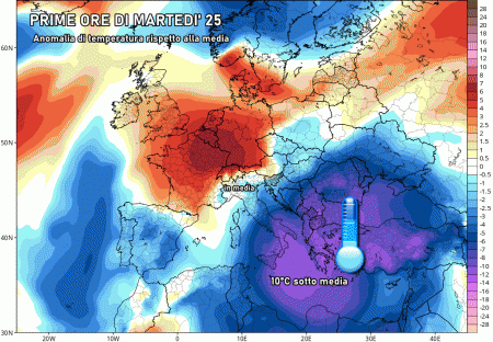 Il peggioramento, tuttavia, sarà molto rapido e già domani avrà totalmente abbandonato l’Italia meridionale. Tornerà il Sole ovunque, ma resterà il gran freddo specie di notte e all’alba: ci aspettiamo un risveglio gelido su tutta Italia, in particolare in pianura Padana e nelle zone interne del centro e del sud. Le minime scivoleranno sotto lo zero anche in Puglia, Basilicata, Calabria, Campania e Molise. Nelle valli e sugli altipiani è probabile l’arrivo di temperature inferiori ai -7/-9°C.