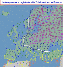 Questa mattina non vi facciamo vedere una mappa di previsione, bensì LA REALTA’, ovvero le temperature che si stanno registrando questa mattina sul nostro Continente. Vi consigliamo di ingrandire la mappa per avere un migliore riscontro visivo.