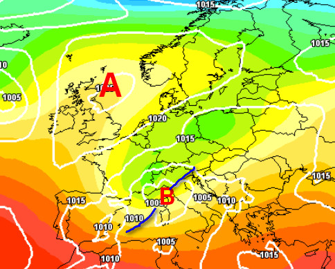 Questo secondo sistema, entrando nel Mediterraneo, formerà una depressione; di conseguenza il suo moto verso levante sarà rallentato. Ecco la situazione sinottica attesa nelle ore centrali di giovedi 3 ottobre:
