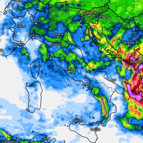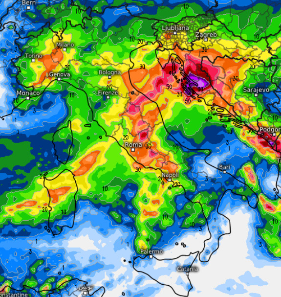 Questa invece è la sommatoria delle precipitazioni attese in Italia nell’arco della giornata di venerdi 4 ottobre: