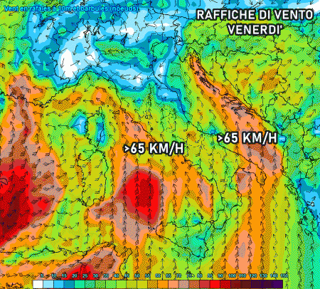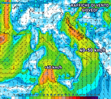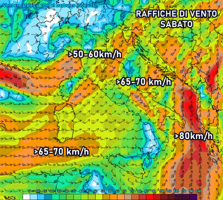 La giornata di venerdì sarà quella più insidiosa a causa delle potenti raffiche dai quadranti meridionali, le quali rischiano di raggiungere punte di 70 km/h e occasionalmente anche valori più elevati lungo le regioni tirreniche e il sud Italia. Tra Sardegna e Sicilia spiccano raffiche di tempesta, oltre 100 km/h.