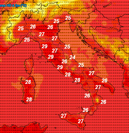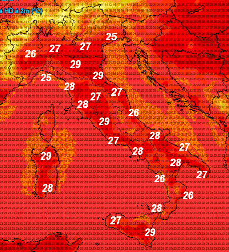 Valori quasi ovunque sopra i 25°, con diffuse punte di 28-29°. Vedremo se nella seconda dacade questa situazione troverà termine, continuate a seguirci.