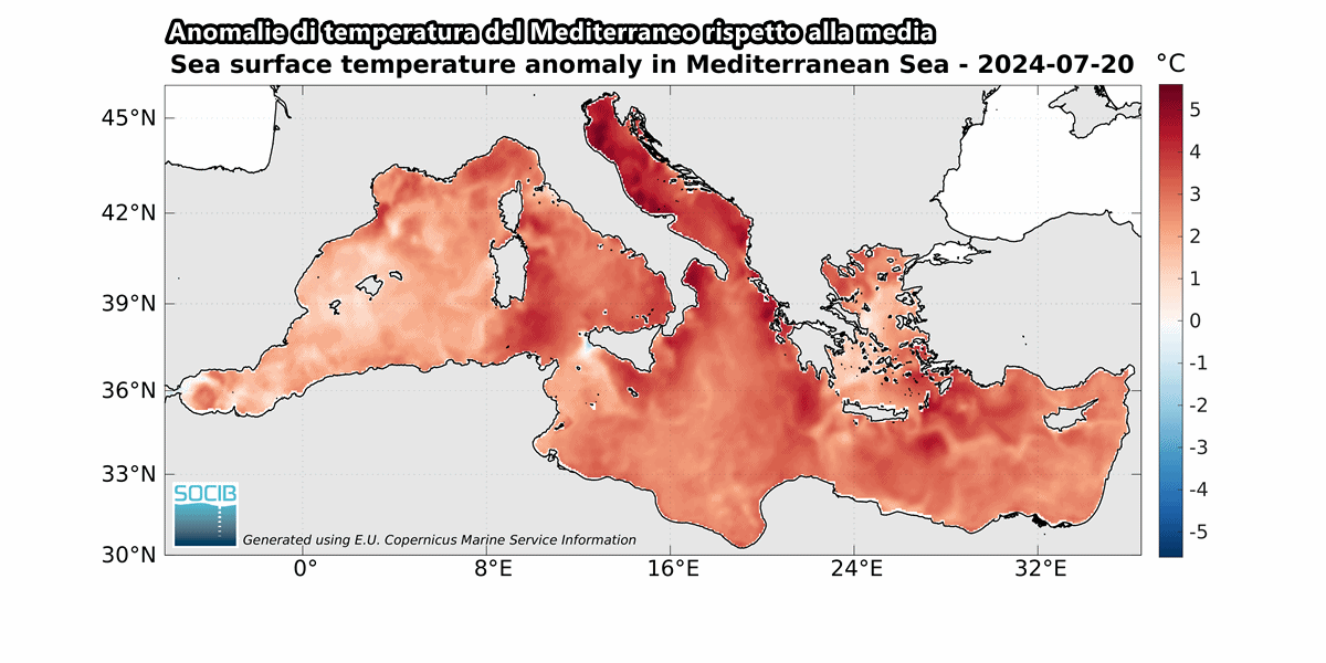 La temperatura superficiale dei nostri bacini ha superato quasi ovunque i 27°C, ma la situazione più critica è sull’alto Ionio e sul mar Adriatico dove si registrano già temperature di 30°C, un valore assolutamente esagerato per il “mare nostrum” nel mese di Luglio.
