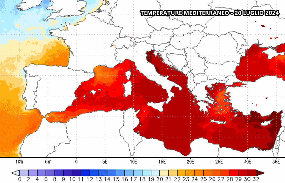 La pesante e interminabile ondata di caldo che sta avvolgendo il Mediterraneo da oltre due settimane sta avendo ripercussioni notevoli sulle temperature del Mediterraneo. L’attuale fotografia del Mediterraneo è decisamente clamorosa, considerando che siamo appena a metà dell’Estate.