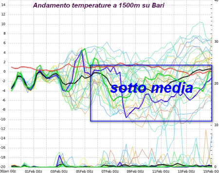 E infatti le carte "spaghetti" relative alla città di Bari, evidenziano proprio come in quasi tutti gli scenari del modello americano, vengano lette temperature ben al di sotto delle medie del periodo a 1500m praticamente per tutta la prima decade di febbraio, un risultato sorprendente: