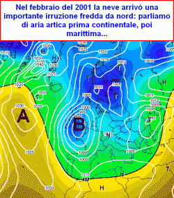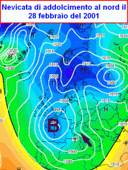 Negli ultimi giorni del febbraio del 2001 un ramo del vortice polare venne a trovare l’Italia e portò dapprima il freddo e qualche nevicata a quote molto basse al centro-sud e su parte del nord, poi scese un altro vortice depressionario più ad ovest e ci raggiunse in modo molto diretto, avvettando aria particolarmente umida da sud sul settentrione e favorendo precipitazioni nevose anche importanti il 28 febbraio, naturalmente sino in pianura, favorite anche dall’inserimento diretto del nucleo depressionario più freddo in quota sul settentrione nelle ore successive.