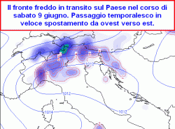 Durante la notte tra venerdì e sabato un’ulteriore calo dei geopotenziali in quota e della pressione al suolo, introdurrà il frente freddo al settentrione. Il fronte freddo transiterà con tutta probabilità durante le ore centrali di sabato 9 giugno portando con se una veloce sventagliata temporalesca su parecchie regioni del nord.