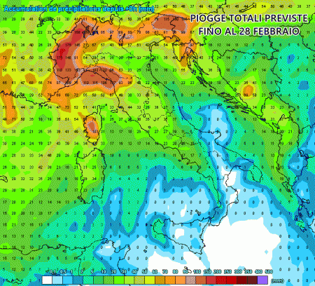 Eloquenti le precipitazioni totali previste fino al termine di febbraio dal modello americano GFS (mappa qui sopra). Gli accumuli di pioggia maggiori prediligerebbero Piemonte, Valle d’Aosta, alta Lombardia, Liguria, Toscana, Lazio, Sardegna, alto Veneto, Trentino alto Adige.