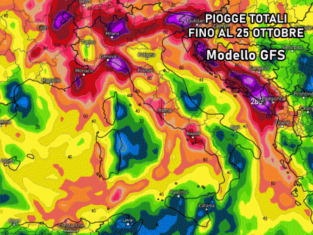 Le mappe delle precipitazioni previste per i prossimi 10 giorni sulla nostra penisola sono davvero notevoli. Il modello americano GFS ci mostra accumuli di pioggia molto sostanziosi, soprattutto al Nord e sull’Alto Tirreno, con punte di pioggia superiori a 150 o 200 mm.