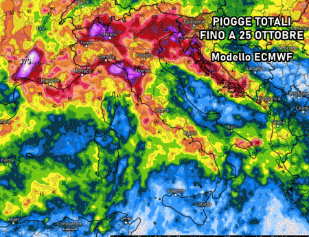Molto simile è il collega europeo ECMWF, che propone accumuli di pioggia decisamente notevoli sul Centro e il Nord Italia, con punte di oltre 200 mm nelle aree evidenziate in viola. Gli accumuli di pioggia sono meno sostanziosi per il Sud, ma ciò non toglie che avremo a che fare con instabilità sparsa e localmente anche qualche forte temporale.