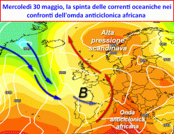 Negli ultimissimi giorni di maggio, come anticipato, saranno soprattutto i settori dell’Italia settentrionale a trovarsi sulla divergenza della corrente a getto,; qui l’aria sarà costretta ad essere chiamata dal basso, al fine di colmare un vuoto di pressione creato dai flussi del vento d’alta quota. sul finire del mese, vi potrà essere qualche episodio temporalesco anche di forte intensità. I temporali potranno colpire soprattutto le località a ridosso dei rilievi montuosi (martedì 29, mercoledì 30, giovedì 31 maggio).