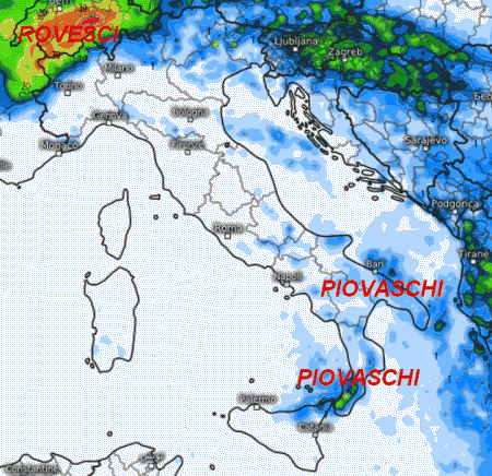 La seconda mappa mostra la sommatoria delle precipitazioni attese in Italia nell’arco della giornata di lunedi 24 aprile: