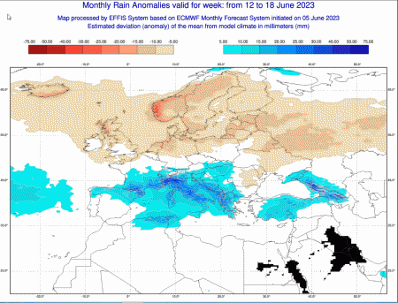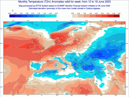Iniziamo con le anomalie termiche riferite alla prossima settimana (dal 12 al 18 giugno)-si consiglia di ingrandire le mappe per avere un migliore riscontro visivo:
