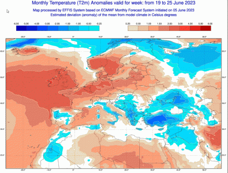 Passiamo ora alla settimana successiva, ovvero dal 19 al 25 giugno. La prima mappa mostra le anomalie termiche che avremo in italia nel periodo suddetto: